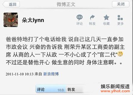 除了“优秀给力”的公务员老公,“朵太lynn”也会“拼爹”。2010年11月10日,她发微博:“爸爸打电话给我,说自己这几天一直参加市政会议,兴奋地告诉我,刚荣升某区工商委的副主任,从商的人一下从政……”另外还有老爹打电话给她,“聊他最近收购了家西餐咖啡厅,已经装修起来了,资金数百万,绝对大工程啊……”